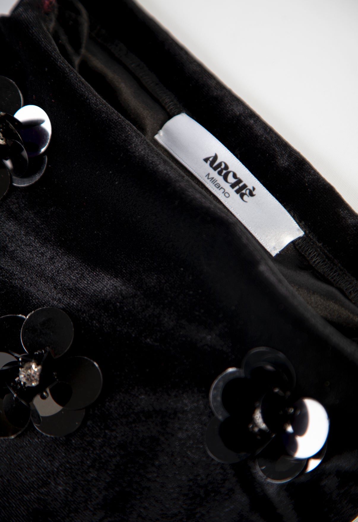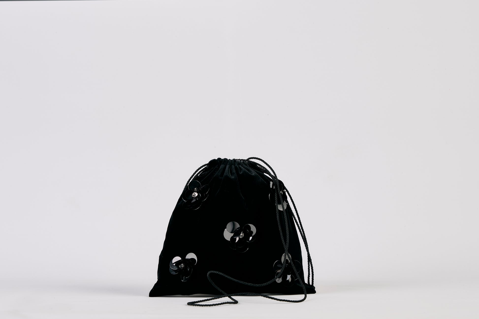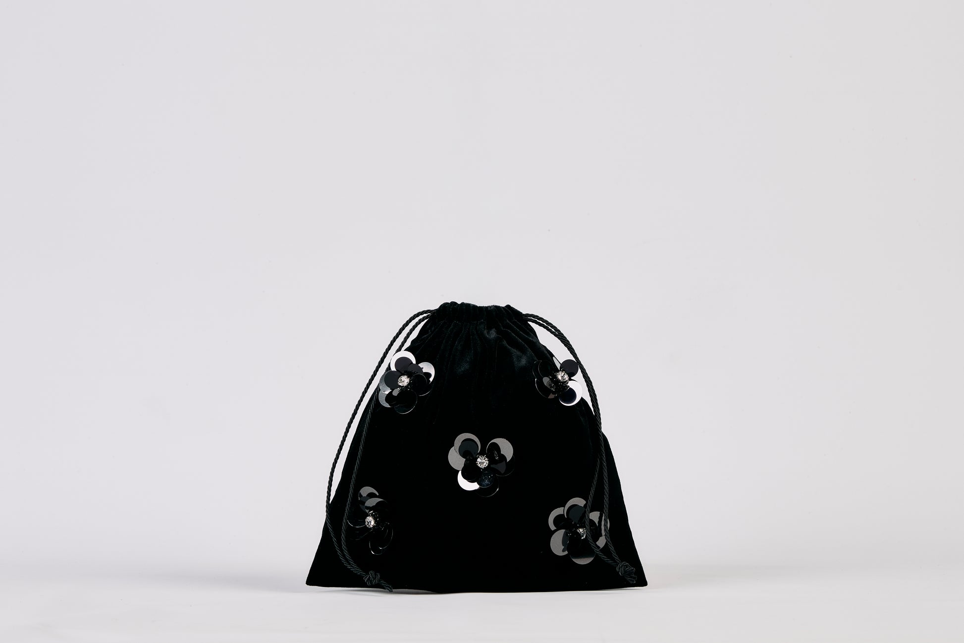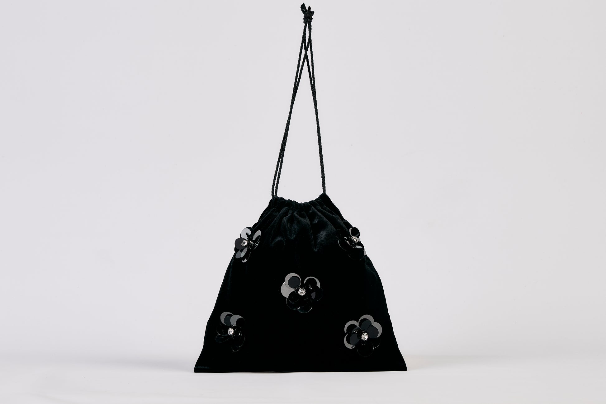 Sacchettino in velluto con fiori di paillettes ricamati a mano e fodera in raso.